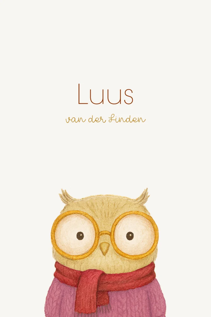 Grappige uil met bril, sjaal en truitje aan. Een eigenwijs en humoristisch kaartje voor de herfst- en winter baby's.