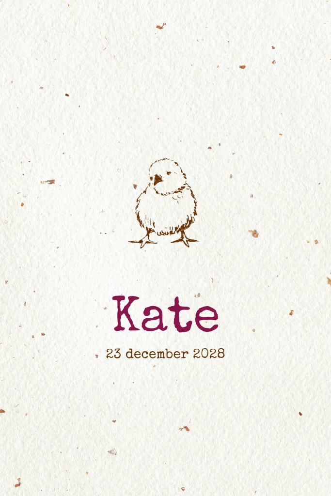 Lief unisex geboortekaartje met gevlekte achtergrond en een schets kuikentje.