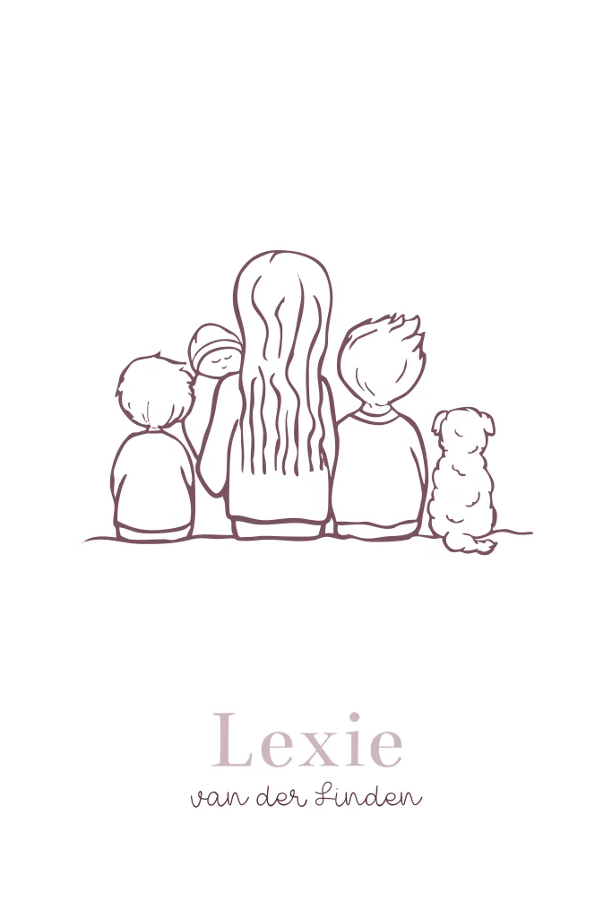 Geboortekaartje voor een meisje. Met een lijntekening van een grote zus en 2 grote broers. Samen met hun huisdier, een boomer hondje.