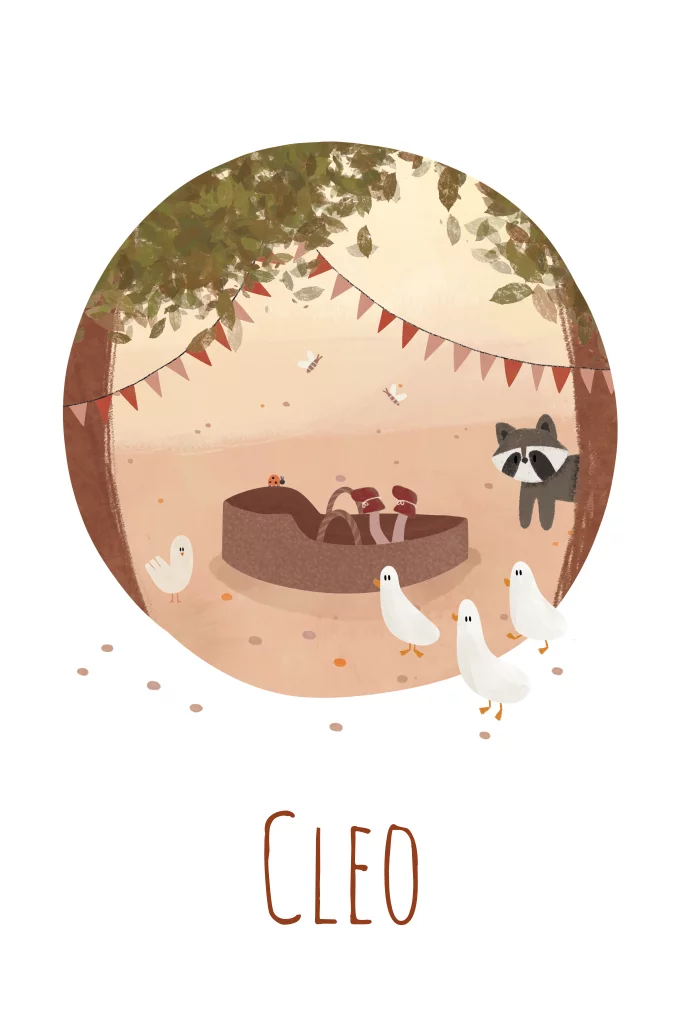 Een grappig geboortekaartje met een mozesmandje in het bos omringd door nieuwsgierige diertjes, zoals eendjes, vlindertjes en een wasbeertje.