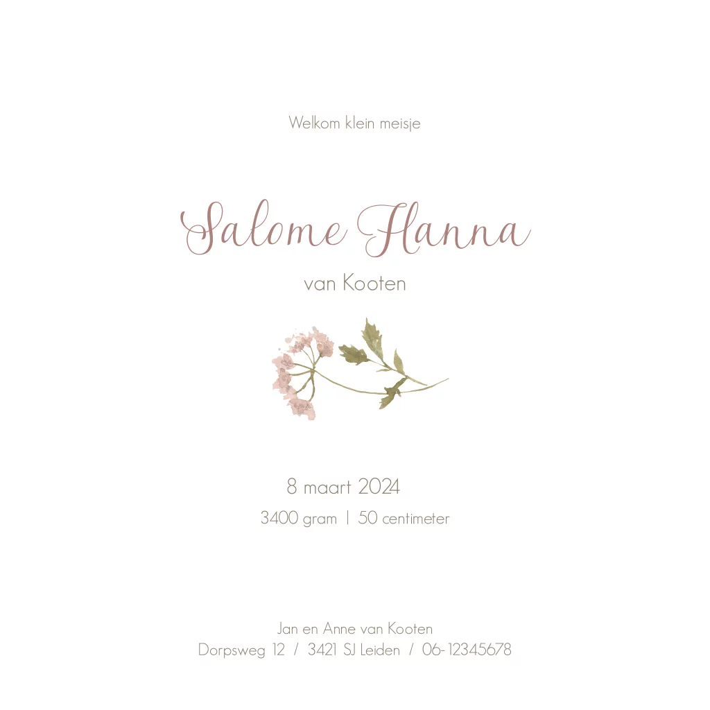 - Marloes“Ruime keuze uit geboortekaartjes die passen bij het seizoen, heel fijn dat je ze zelf kan aanpassen naar smaak. We hadden alles klaar staan en hoefde alleen nog geboorteinfo aan te passen. Daardoor waren de kaartjes al op dag 3 na de geboorte in huis! Superfijn.”