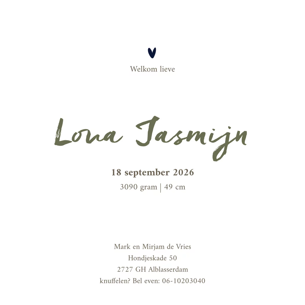 - Marloes“Ruime keuze uit geboortekaartjes die passen bij het seizoen, heel fijn dat je ze zelf kan aanpassen naar smaak. We hadden alles klaar staan en hoefde alleen nog geboorteinfo aan te passen. Daardoor waren de kaartjes al op dag 3 na de geboorte in huis! Superfijn.”
