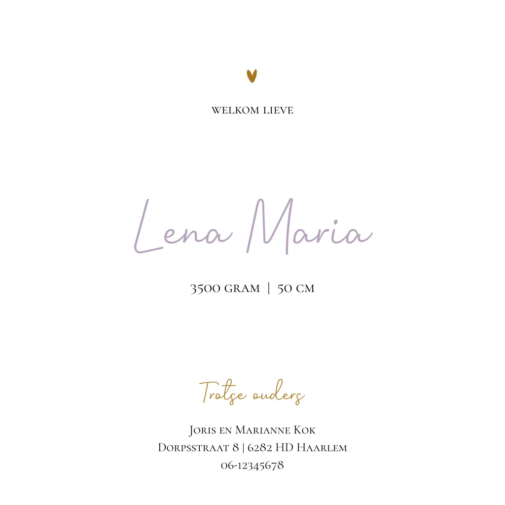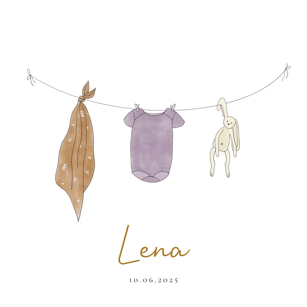 Een lief geboortekaartje met een rompertje, Happy Horse konijntje en een hydrofiele doek aan een waslijn.