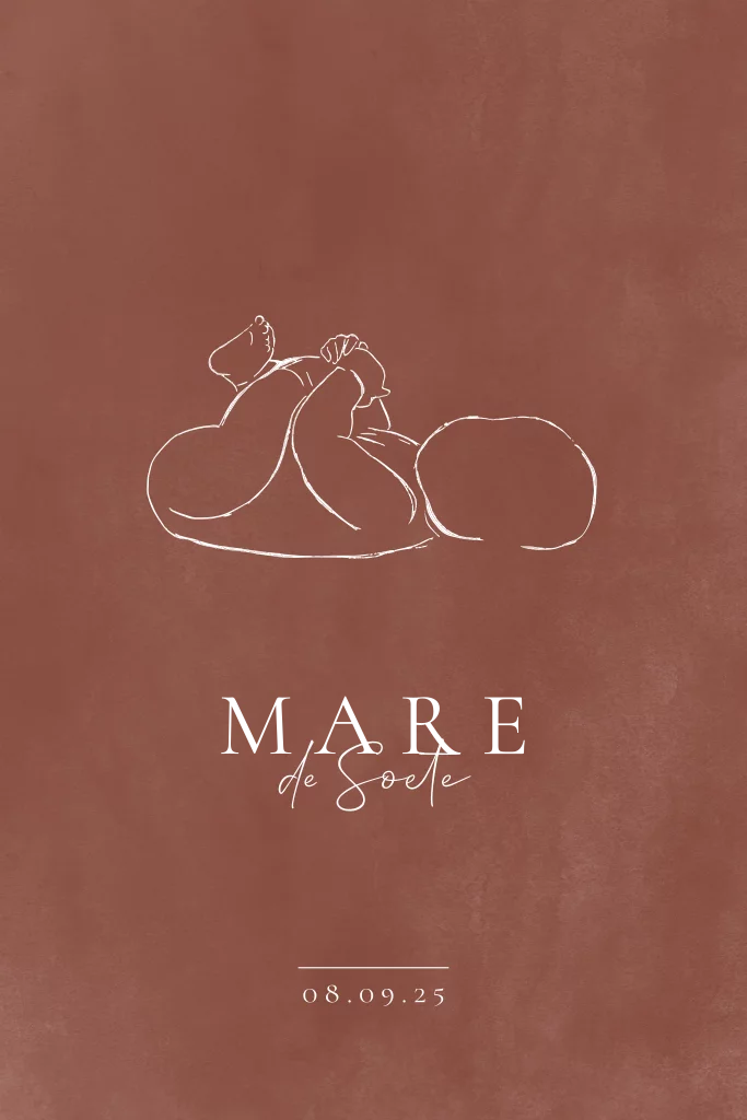 Geboortekaartje met een geschetste illustratie van een baby'tje. De naam op de voorzijde is in goudfolie.