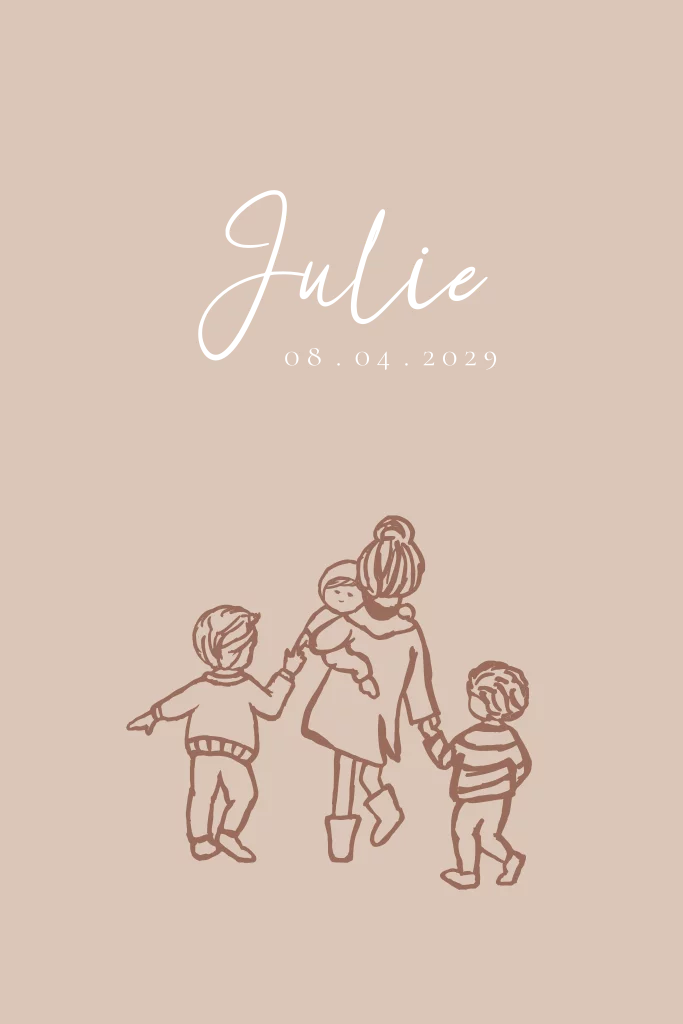 Een geboortekaartje met een grote zus, 2 broertjes aan de hand en een klein zusje in haar armen. De voorzijde is voorzien van folie naam en geboortedatum. Is jouw gezinssamenstelling anders? Mail ons voor een ontwerp op maat!