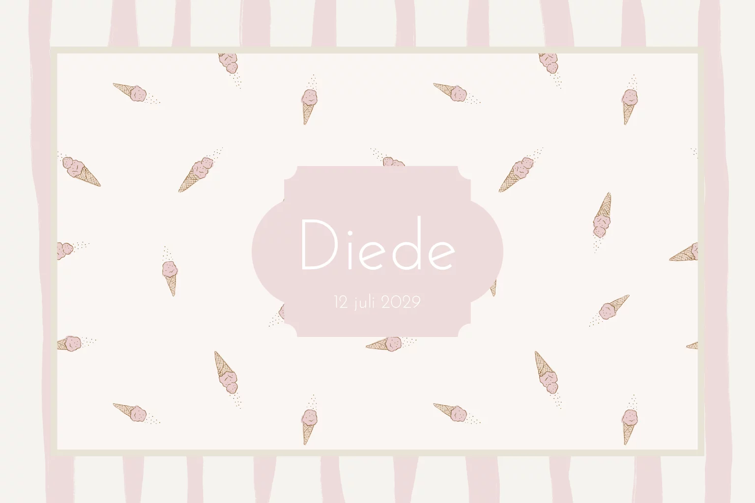 Zomers geboortekaartje voor een meisje. Met ijsjes en streepjes patroon in pasteltinten lichtroze en zandkleur.