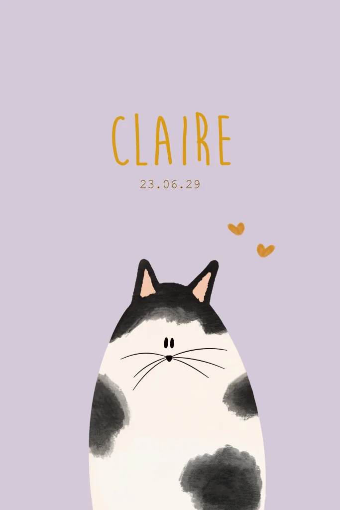 Geboortekaartje voor een meisje met een zwart / witte kat. De illustratie is op een grappige manier getekend. Graag jouw hond of kat op dit geboortekaartje? Mail ons voor hulp bij het ontwerp!
