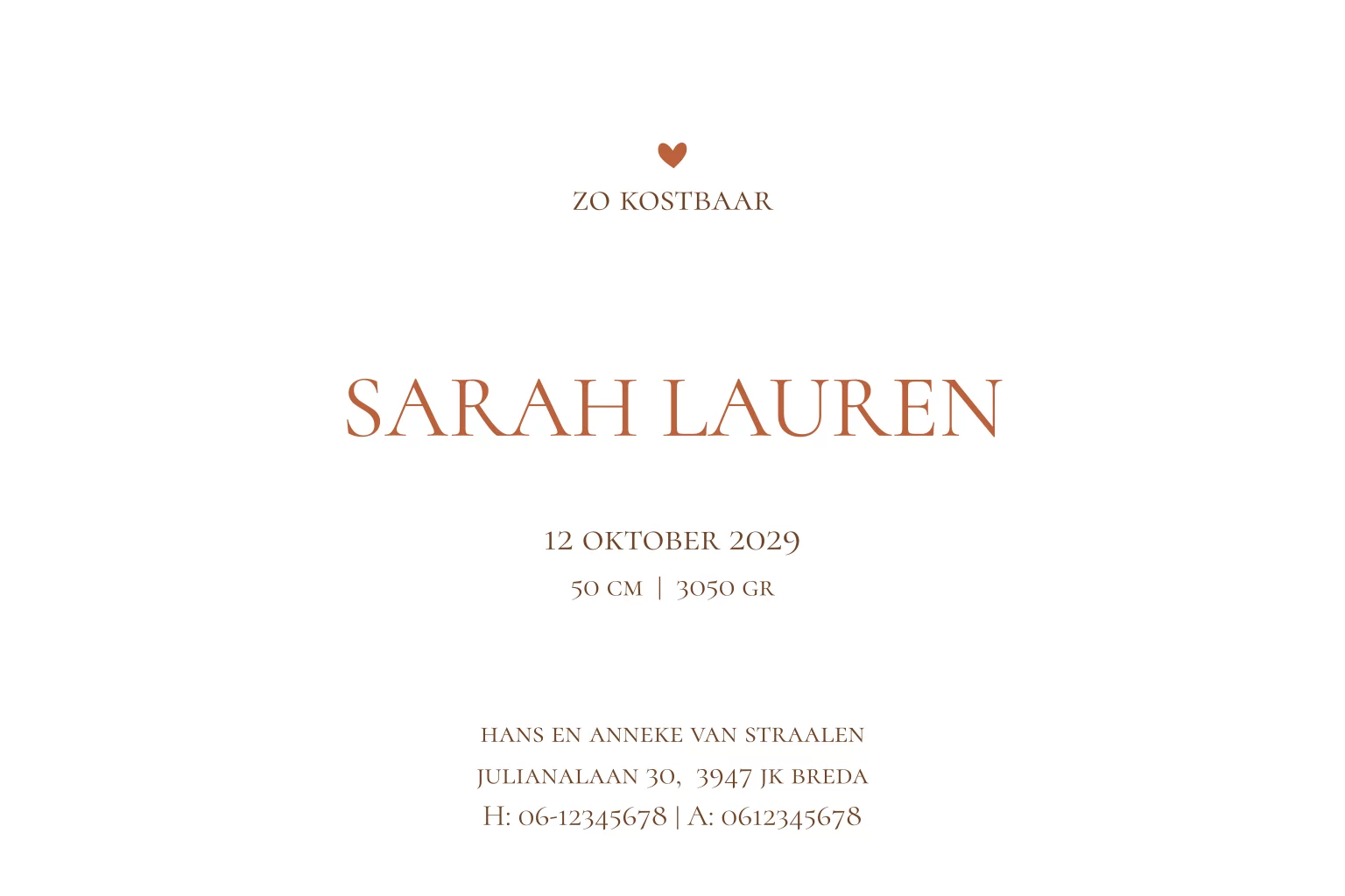 - Marloes“Ruime keuze uit geboortekaartjes die passen bij het seizoen, heel fijn dat je ze zelf kan aanpassen naar smaak. We hadden alles klaar staan en hoefde alleen nog geboorteinfo aan te passen. Daardoor waren de kaartjes al op dag 3 na de geboorte in huis! Superfijn.”