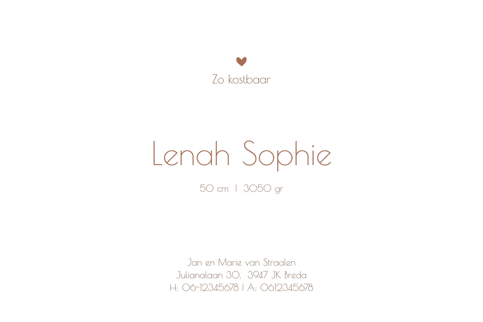 - Marloes“Ruime keuze uit geboortekaartjes die passen bij het seizoen, heel fijn dat je ze zelf kan aanpassen naar smaak. We hadden alles klaar staan en hoefde alleen nog geboorteinfo aan te passen. Daardoor waren de kaartjes al op dag 3 na de geboorte in huis! Superfijn.”