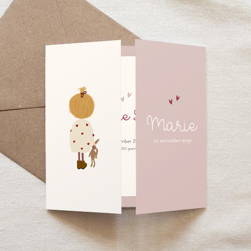 Lief, oudroze geboortekaartje voor een meisje. Met een tweeluik waardoor je het geboortekaartje op een originele manier openklapt.