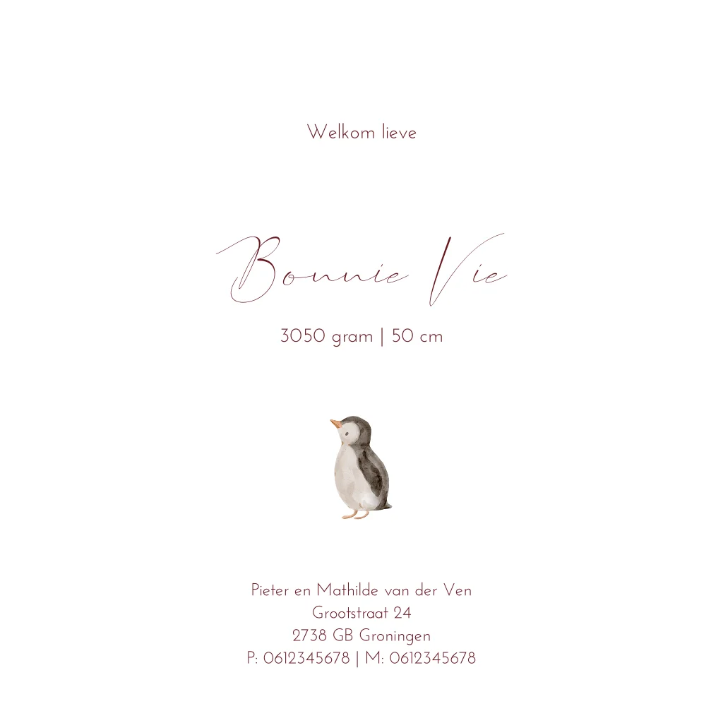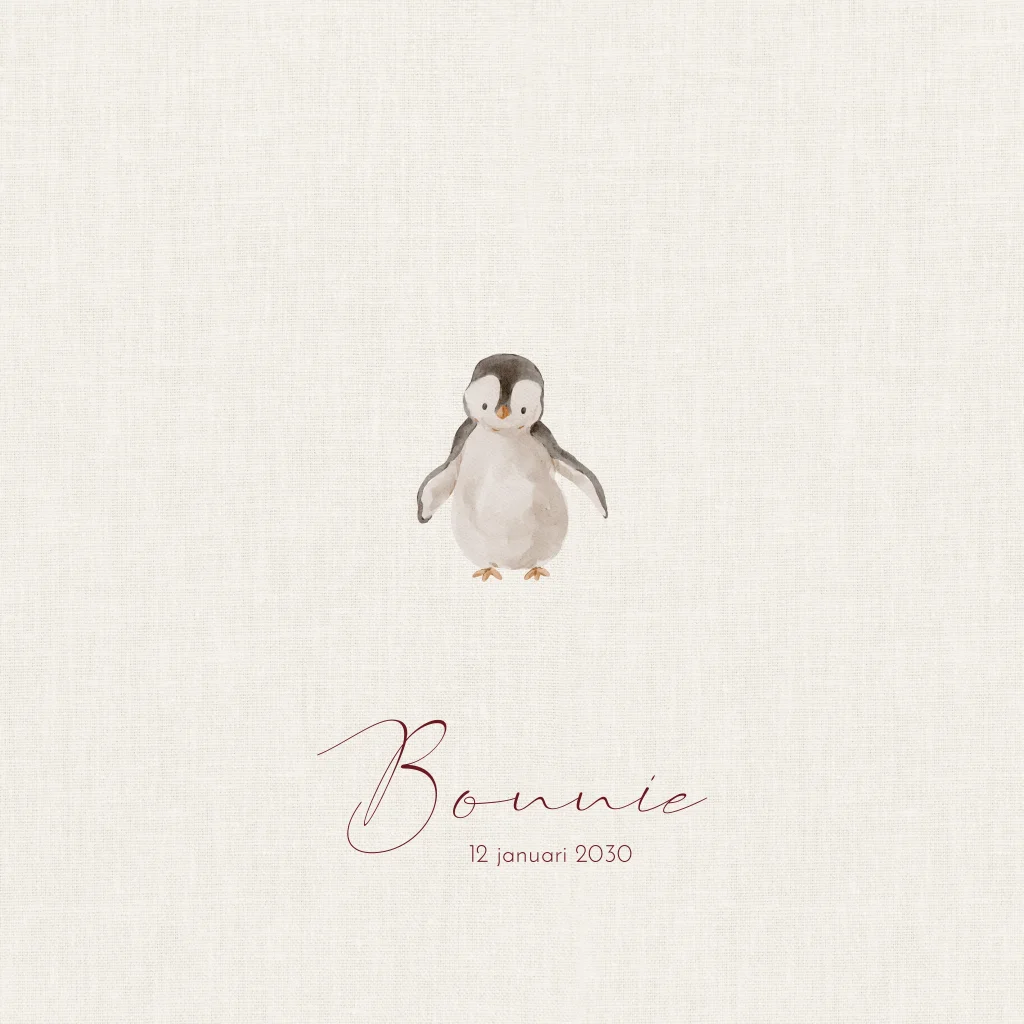Winters en lief geboortekaartje voor een meisje. Met schattige, kleine pinguïn op een neutraal beige achtergrond. Een kaartje om verliefd op te worden!