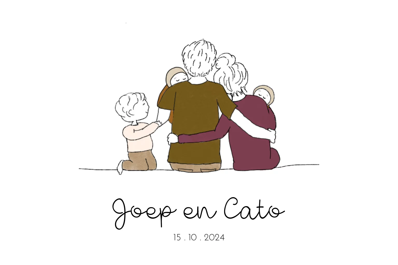 Geboorte van een gezinnetje met een grote broer en een tweeling. Staat jouw gezinssamenstelling er niet tussen? Of wil je de illustratie graag in andere kleuren? Mail ons. Wij passen de illustratie gratis voor je aan!