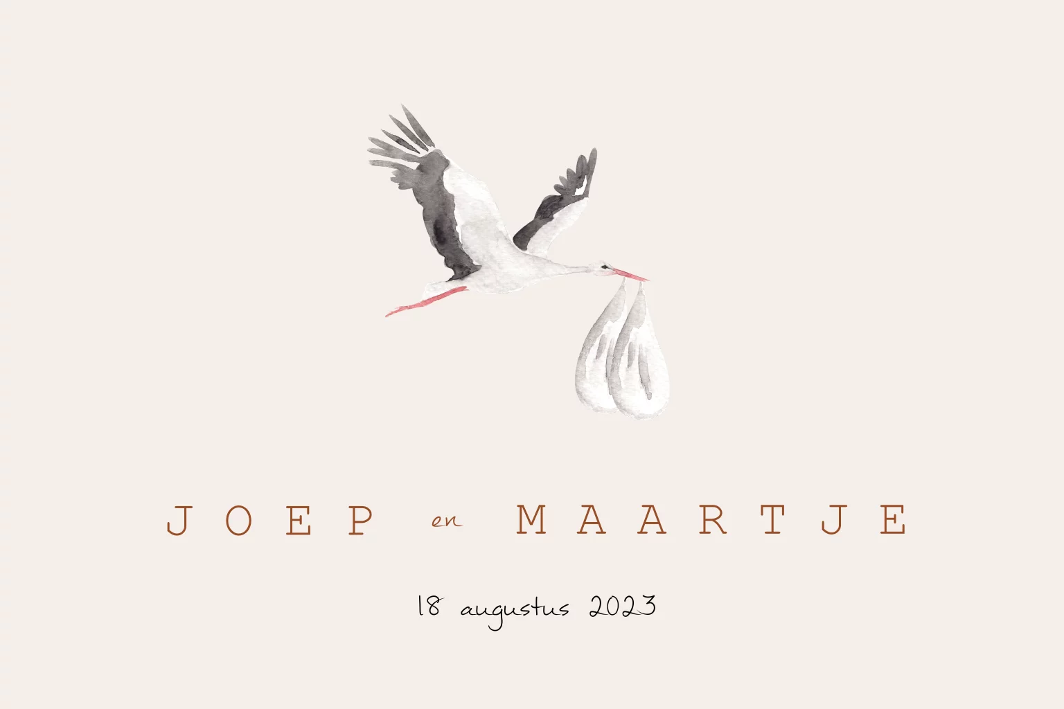 - Marloes“Ruime keuze uit geboortekaartjes die passen bij het seizoen, heel fijn dat je ze zelf kan aanpassen naar smaak. We hadden alles klaar staan en hoefde alleen nog geboorteinfo aan te passen. Daardoor waren de kaartjes al op dag 3 na de geboorte in huis! Superfijn.”
