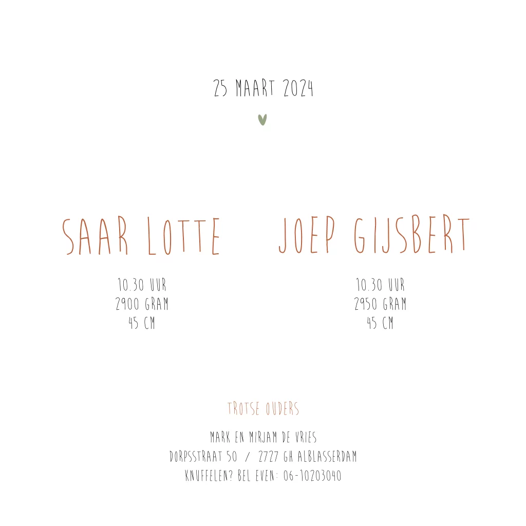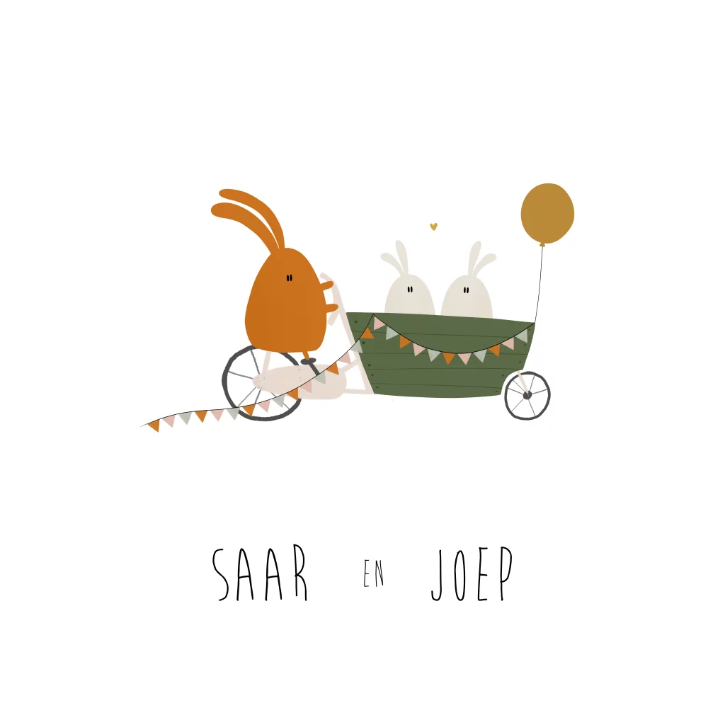 Een grappig geboortekaartje met tweeling konijntjes op en in een bakfiets. Wil je deze tekening met meer konijntjes of in andere kleuren? Mail dan naar info@studiodijs.nl voor gratis hulp.