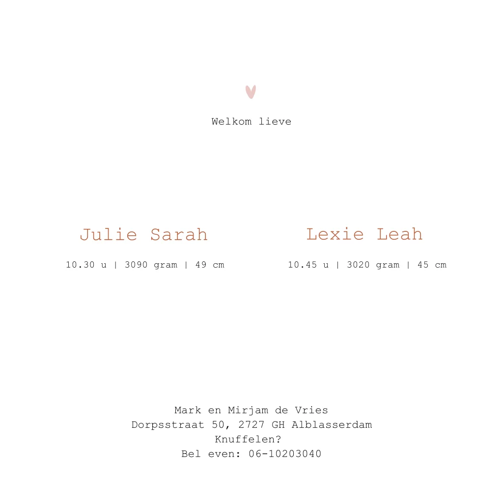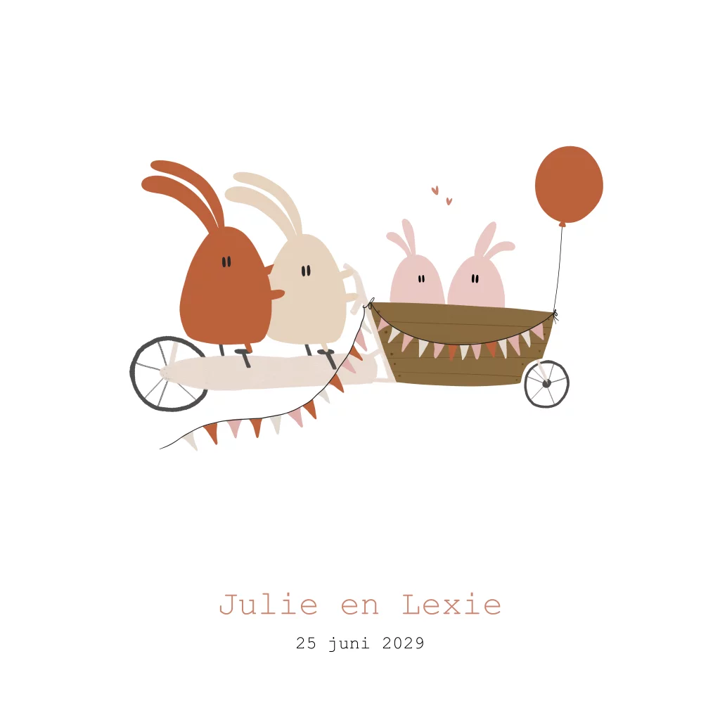 Een grappig geboortekaartje voor een meisjes tweeling met 4 konijntjes op en in een bakfiets. Verander de kleuren van de konijntjes zelf eenvoudig in de online editor. Mail ons voor hulp bij het ontwerp!