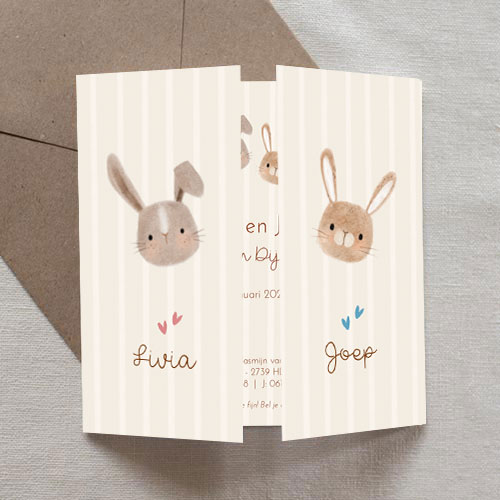 - Marloes“Ruime keuze uit geboortekaartjes die passen bij het seizoen, heel fijn dat je ze zelf kan aanpassen naar smaak. We hadden alles klaar staan en hoefde alleen nog geboorteinfo aan te passen. Daardoor waren de kaartjes al op dag 3 na de geboorte in huis! Superfijn.”