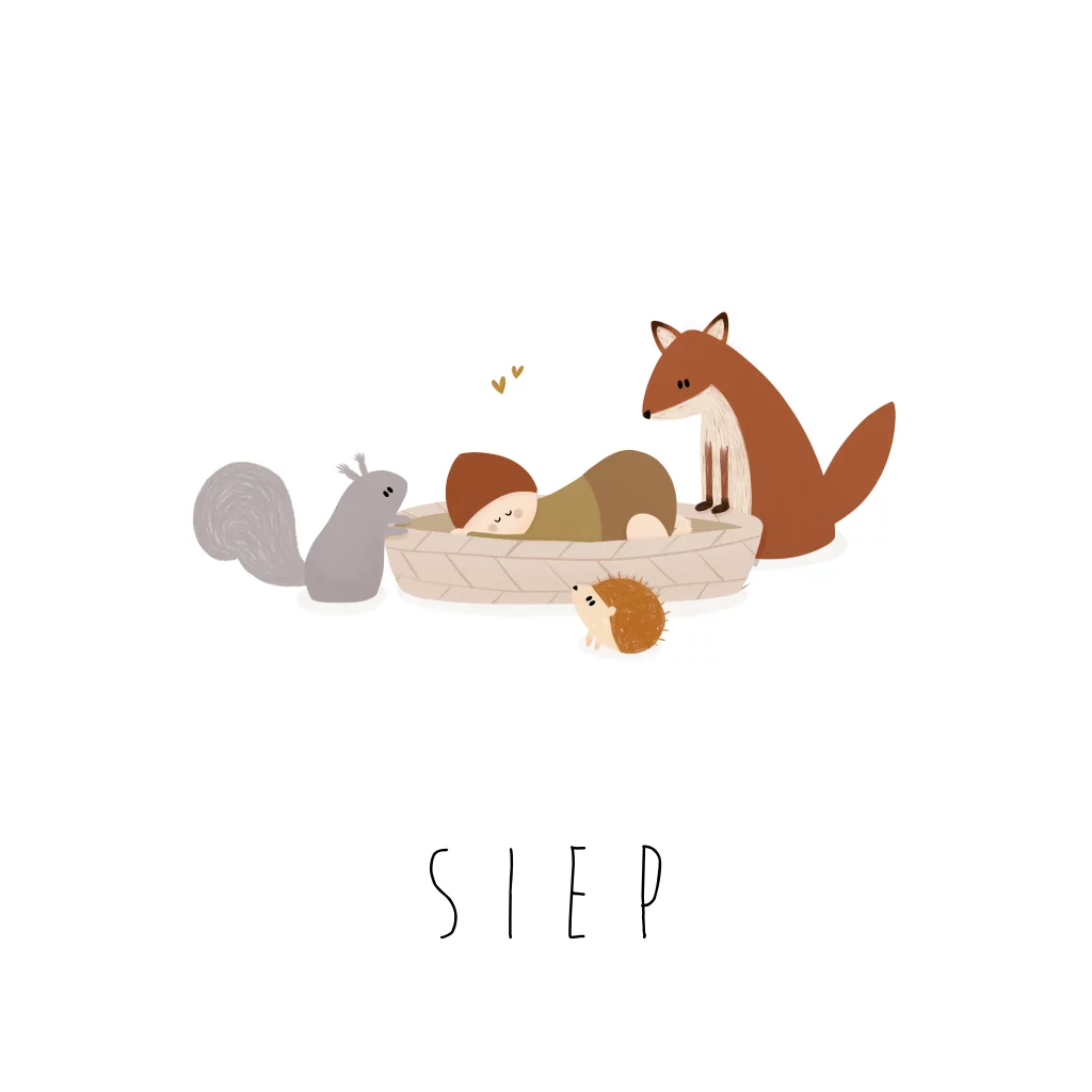 Een grappig geboortekaartje met een vos, egel en eekhoorn die kijken naar een lief slapend baby'tje in een mozesmandje.