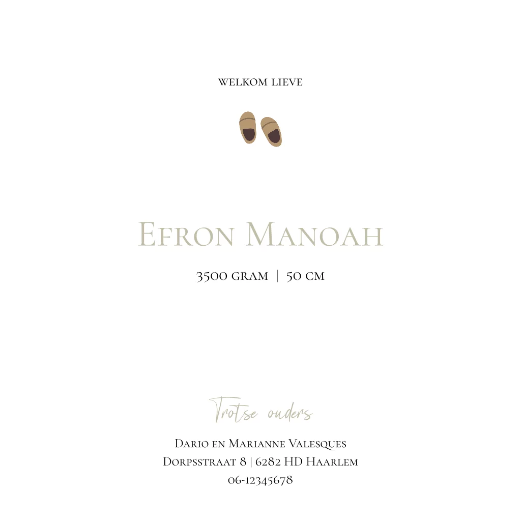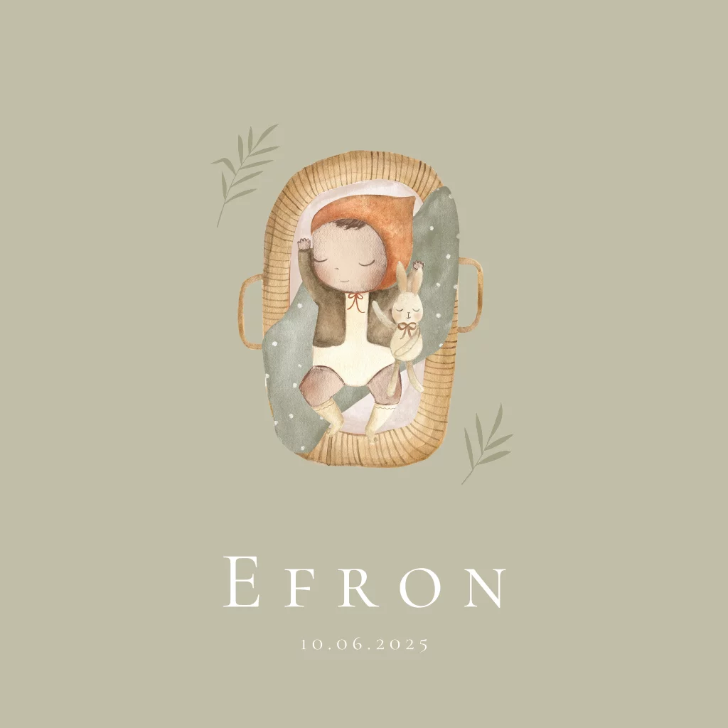 Een lief geboortekaartje met een illustratie van een kleine baby in een mozesmandje
