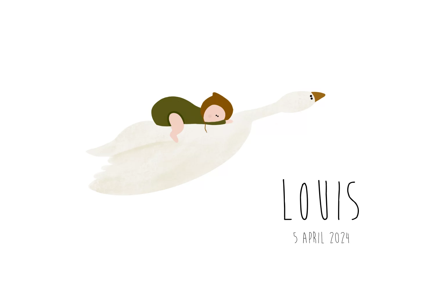 Een grappig geboortekaartje met een baby op een vliegende gans.