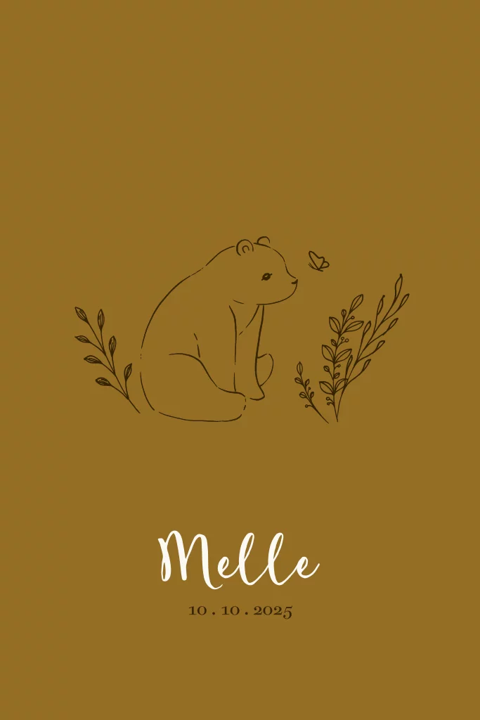 Een minimalistisch geboortekaartje een lief beertje tussen de takjes, kijkend naar een rondvliegend vlindertje.