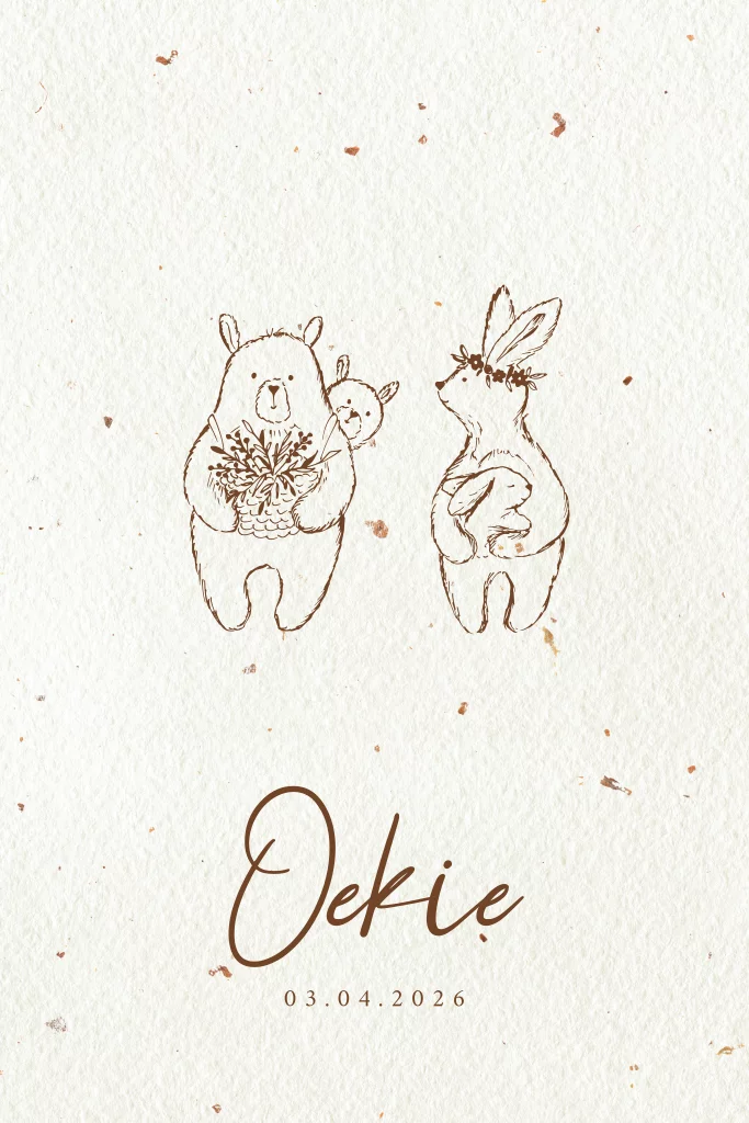 Geboortekaartje met een schetstekening van een beer met klein beertje op zijn rug en een konijn met een klein konijntje in de armen. Leuk voor een family of four! Wij adviseren Oud Hollands papier bij deze kaart.