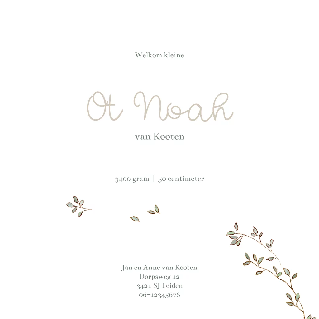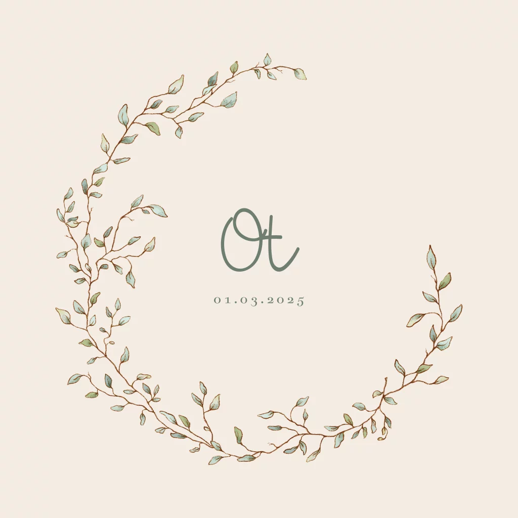Geboortekaartje met een bladerkrans in zachte natuurtinten