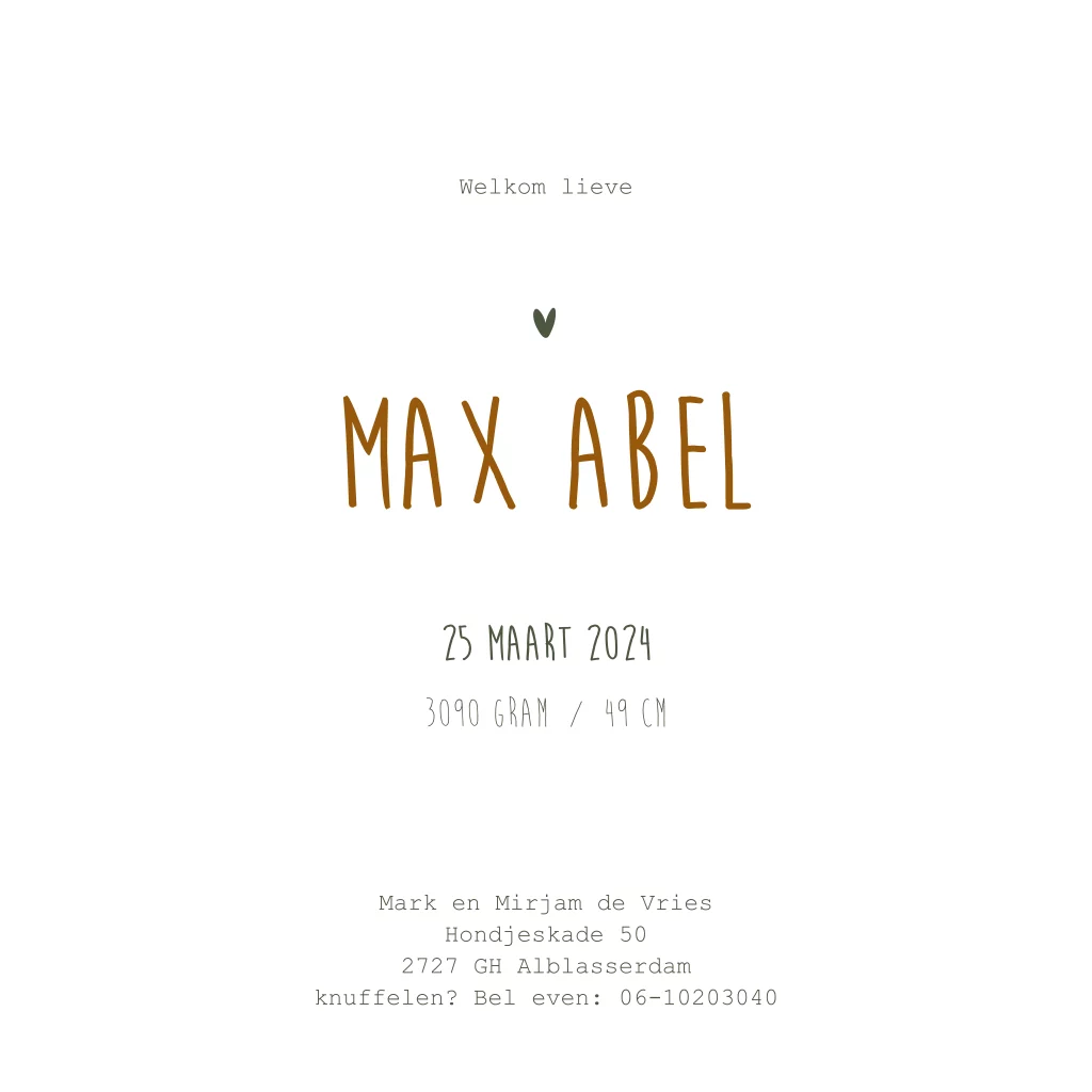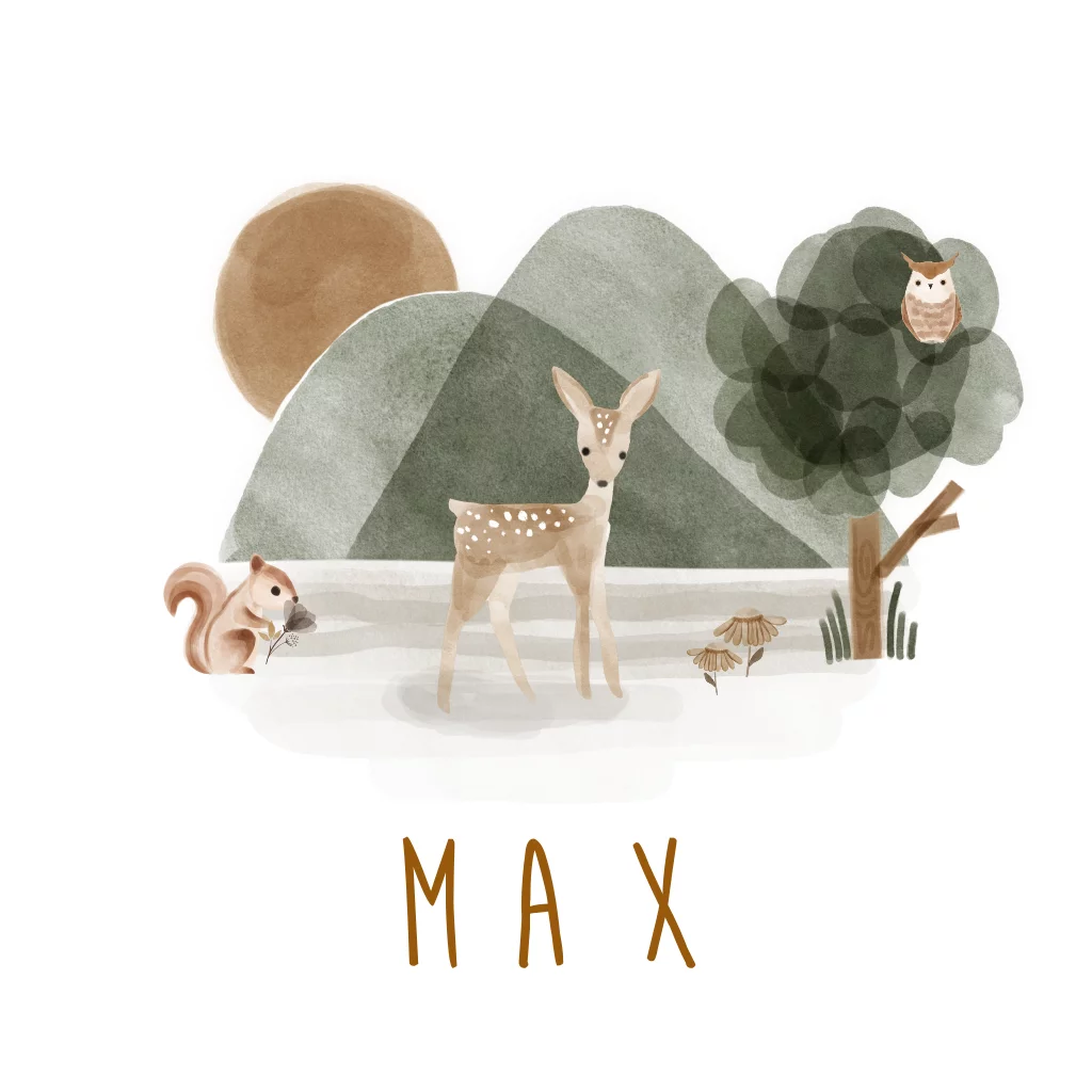 Een vrolijk geboortekaartje met een hertje, eekhoorn en uiltje in het bos.