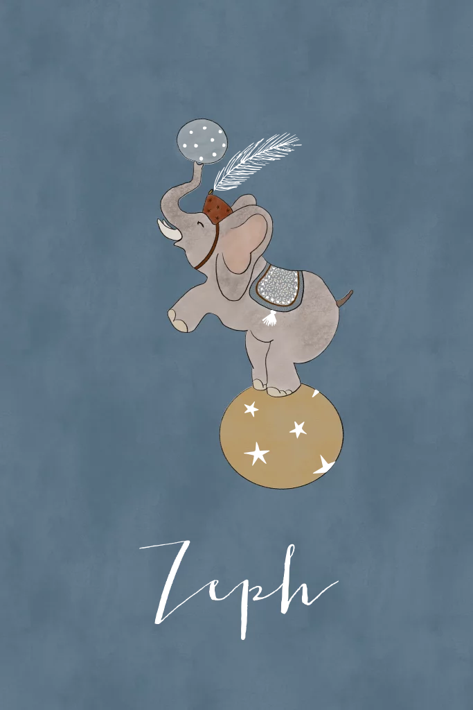Geboortekaartje met een circusolifant. De circus illustratie heeft een vrolijke uitstraling met allerlei goudfolie elementen. Bij dit ontwerp adviseren we linnen papier.