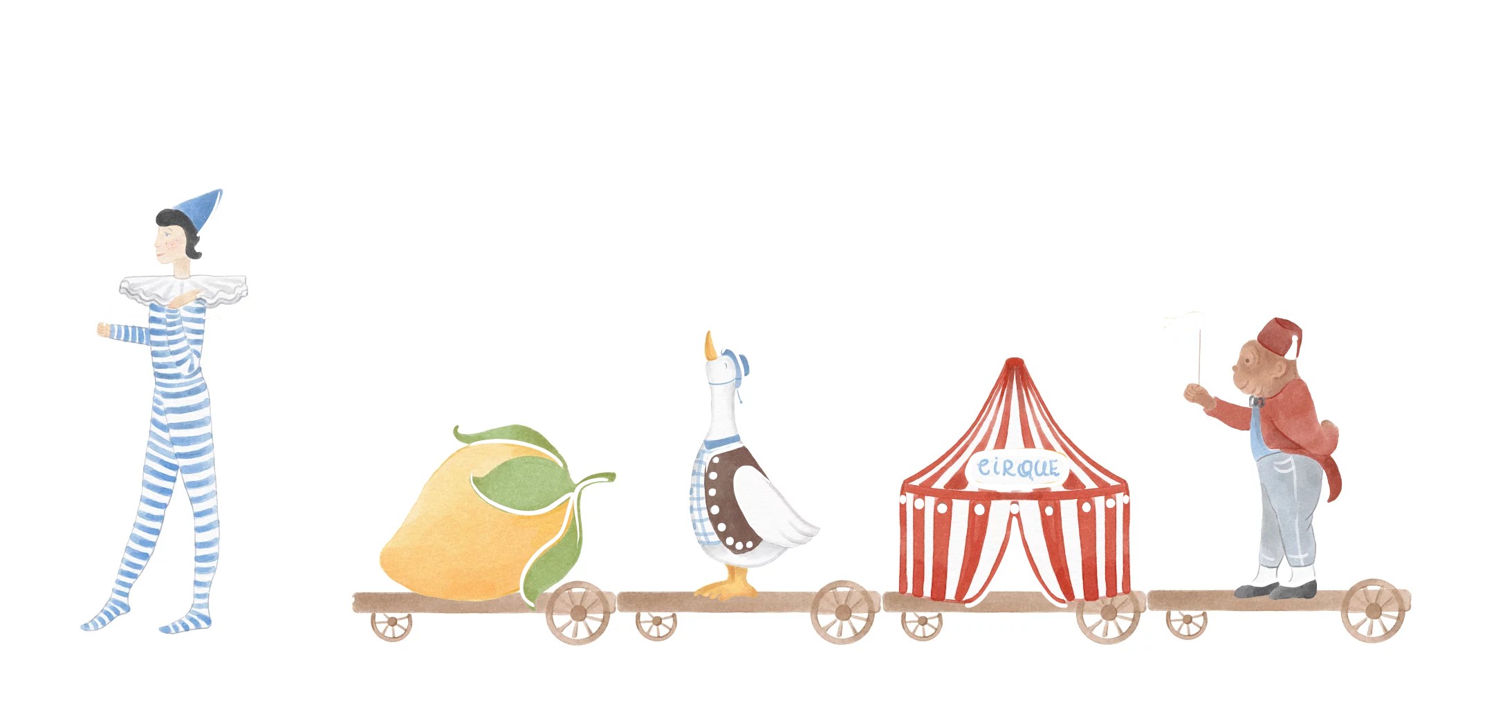 Een lief geboortekaartje met een vrolijke circustrein gebaseerd op de prachtige trein van Konges Slojd. De trein wordt getrokken door een circusman met daarachter een citroen, circustent, gans en aap. De illustratie is voorzien van goudfolie elementen.