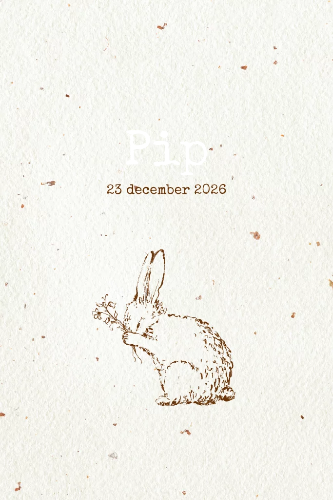 Lief unisex geboortekaartje met een klein konijntje. De achtergrond heeft lichte vlekjes voor een extra mooi effect.