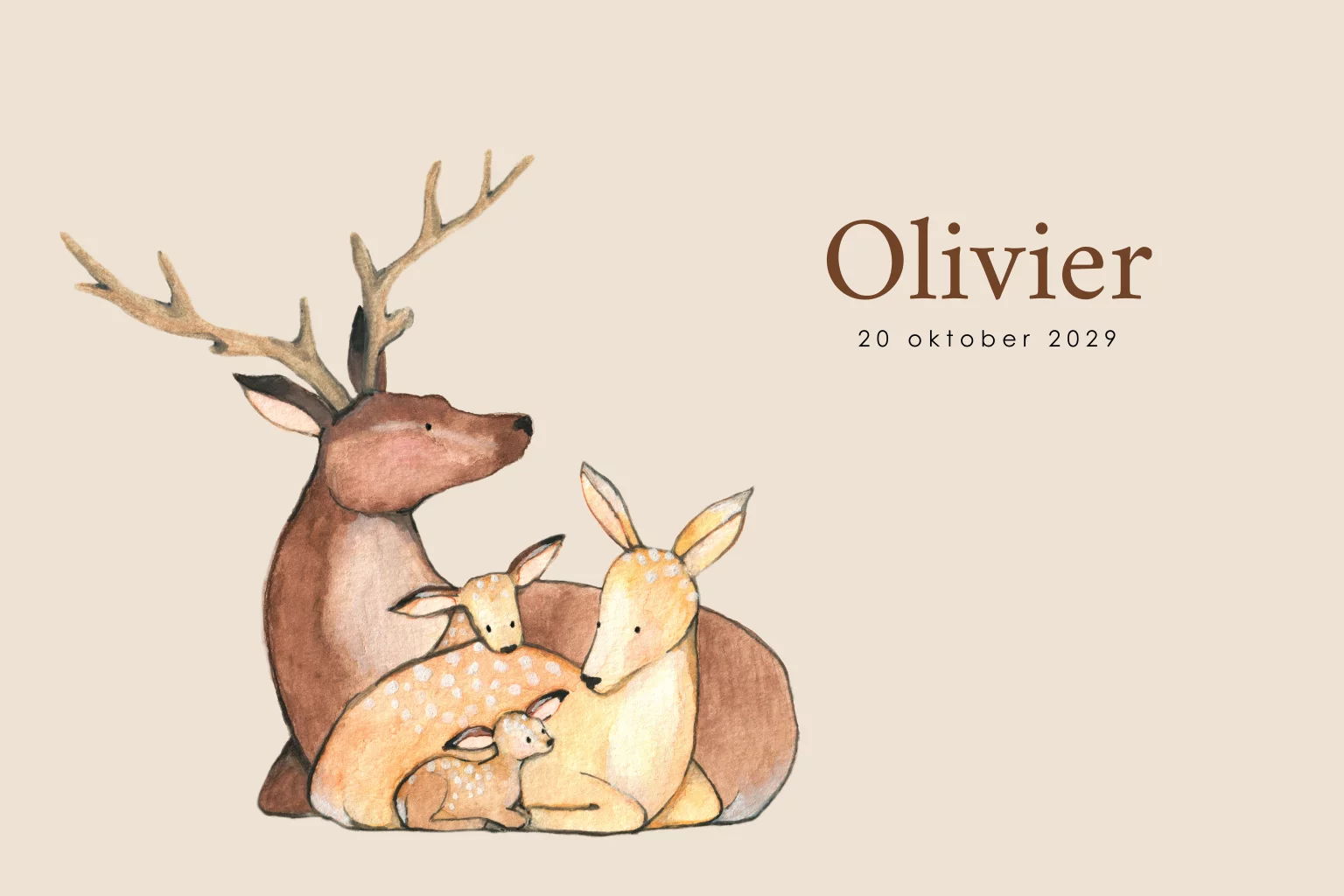 Lief geboortekaartje met een gezin van vier hertjes. Deze illustratie is ontworpen door kinderboeken illustrator Maartje Riksma.