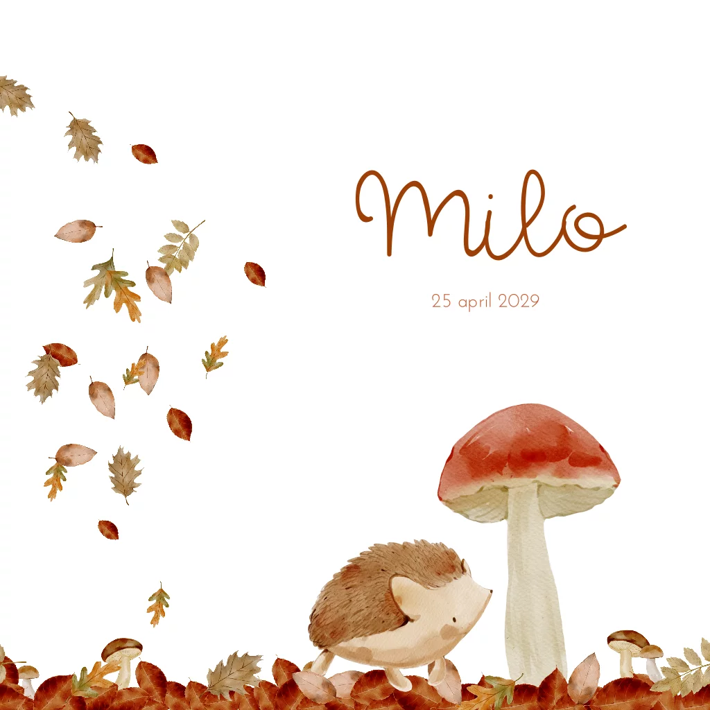 Geboortekaartje voor de herfstbaby. Met vallende blaadjes en een nieuwsgierig egeltje bij de paddenstoelen.