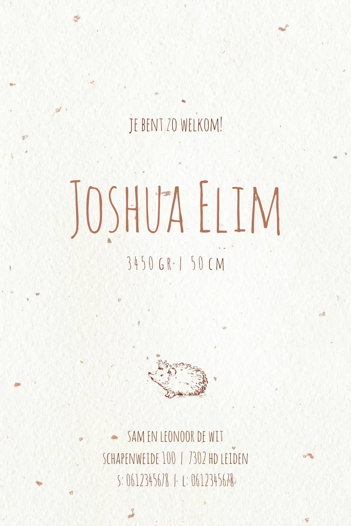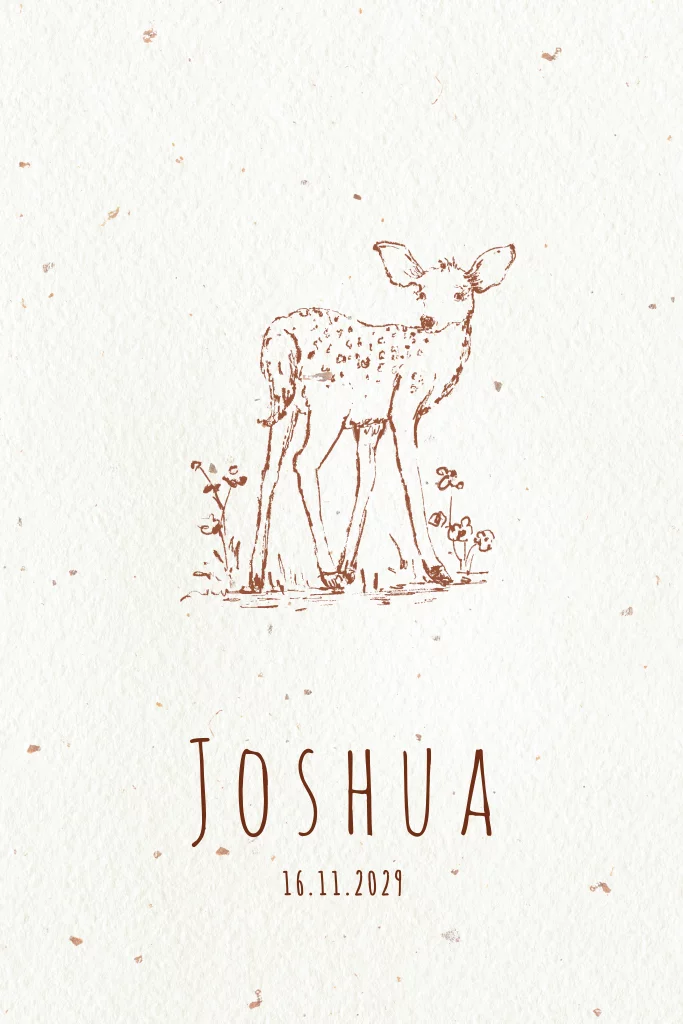 Neutraal geboortekaartje met een hertje op de voorzijde. De kaart heeft een gevlekte achtergrond. Een mooi passend kaartje voor een baby die in de herfst geboren wordt.