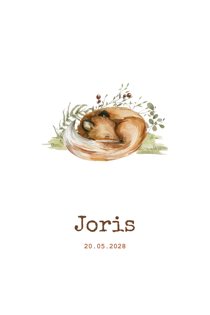 Geboortekaartje met een illustratie van een slapend vosje tussen de blaadjes en takjes. Een super lief geboortekaartje voor zowel jongens als meisjes!