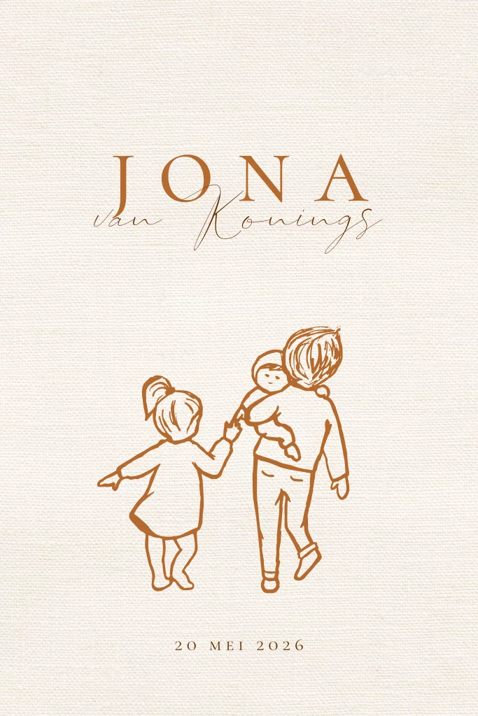 Een minimalistisch geboortekaartje met een fijne linnen look structuur achtergrond. Gecombineerd met een lieve illustratie van een trotse broer en zus die hun baby broertje of zusje vasthouden.