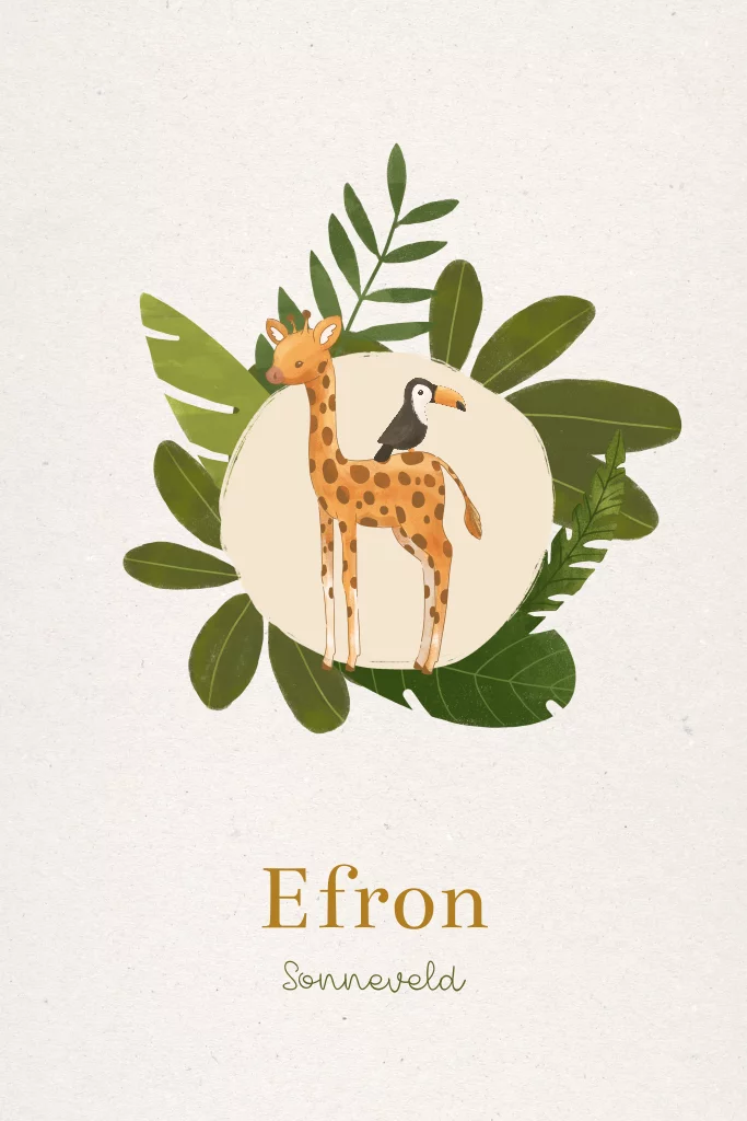 Een lief jungle geboortekaartje met een giraffe en toekan.