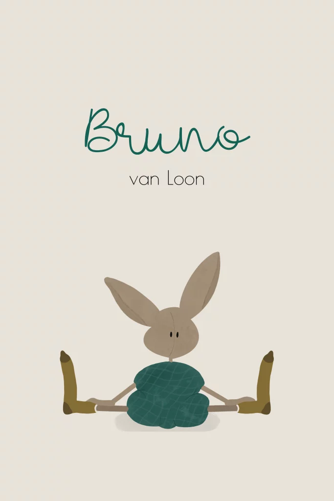 Een lief geboortekaartje voor een jongen of meisje met een knuffel konijntje met kleertjes en kousjes aan.