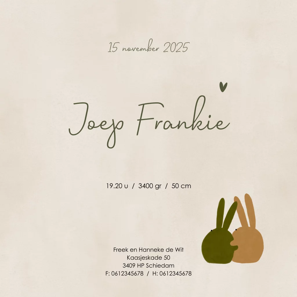 - Marloes“Ruime keuze uit geboortekaartjes die passen bij het seizoen, heel fijn dat je ze zelf kan aanpassen naar smaak. We hadden alles klaar staan en hoefde alleen nog geboorteinfo aan te passen. Daardoor waren de kaartjes al op dag 3 na de geboorte in huis! Superfijn.”