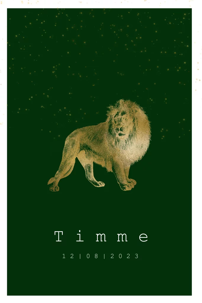 Geboortekaartje met een stoere leeuw in gouden look. Het is dus geen goudfolie, maar heeft wel de gouden charmes!