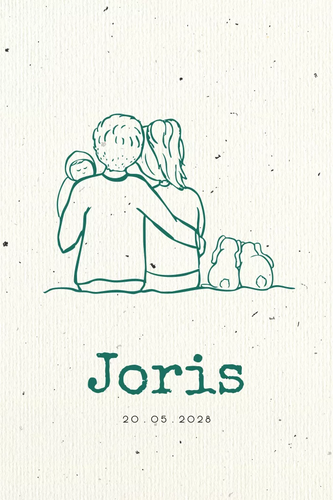 Een origineel geboortekaartje met gevlekte achtergrond. Met een lieve lijntekening illustratie van een gezin bestaande uit een papa, mama en baby meisje of jongen. Samen met de herdershond. Heb jij een andere gezinssamenstelling? Bekijk dan de afbeeldingen onder 'Gezin lijntekeningen'. Staat jouw gezinssamenstelling er niet tussen? Mail ons dan voor hulp!