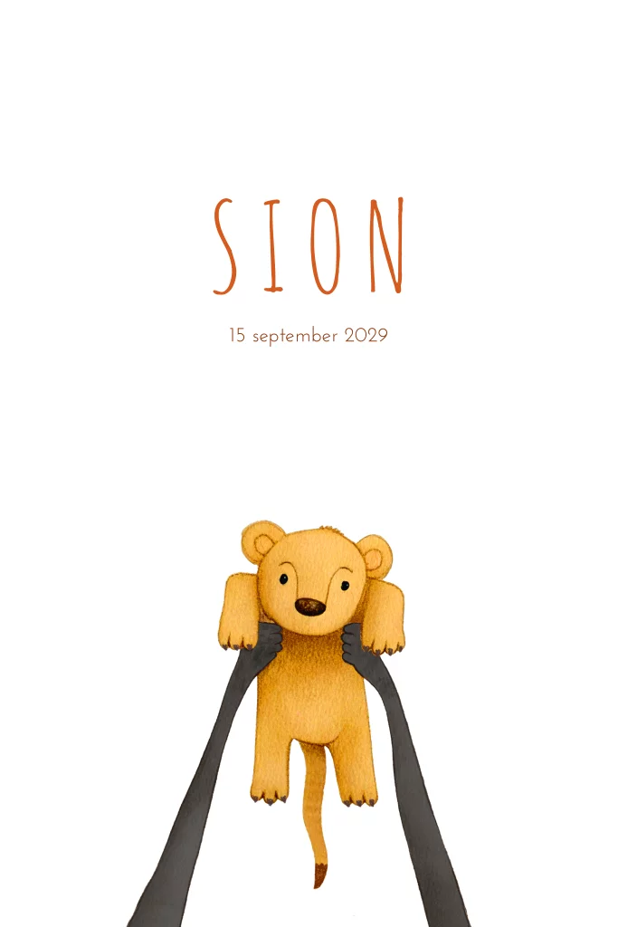 Lief geboortekaartje in Lion King thema met kleine Simba in de armen van Rafiki. Een leuk kaartje voor zowel jongens als meisjes.