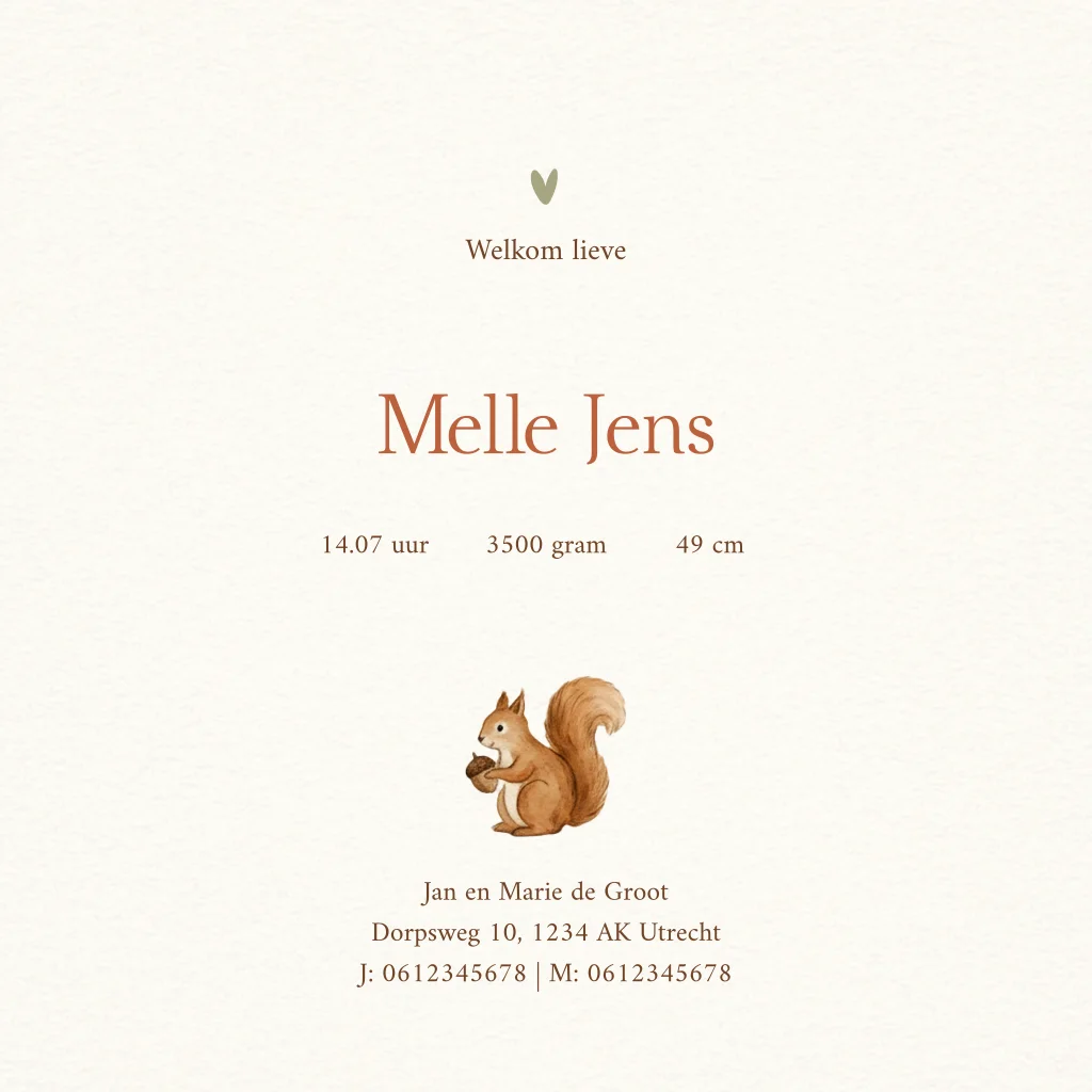 Een schattig unisex geboortekaartje met bosdieren in het bos.