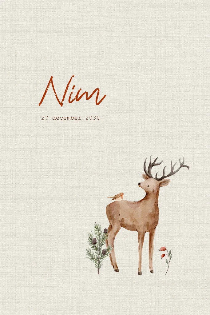 Een winters geboortekaartje voor zowel jongens als meisjes. Een neutraal kaartje voor de echte winter baby's. Met een hertje en roodborstje tussen de winterse takjes.