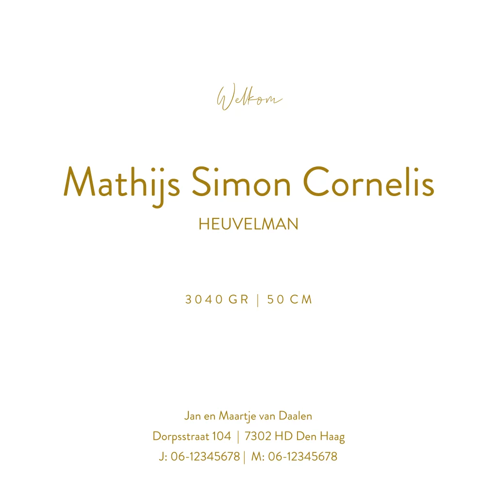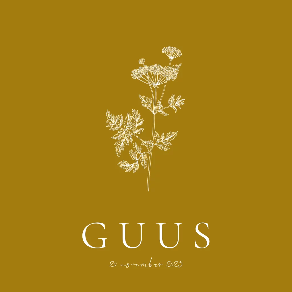 Geboortekaartje in okergele kleur met een minimalistische tak en bloem