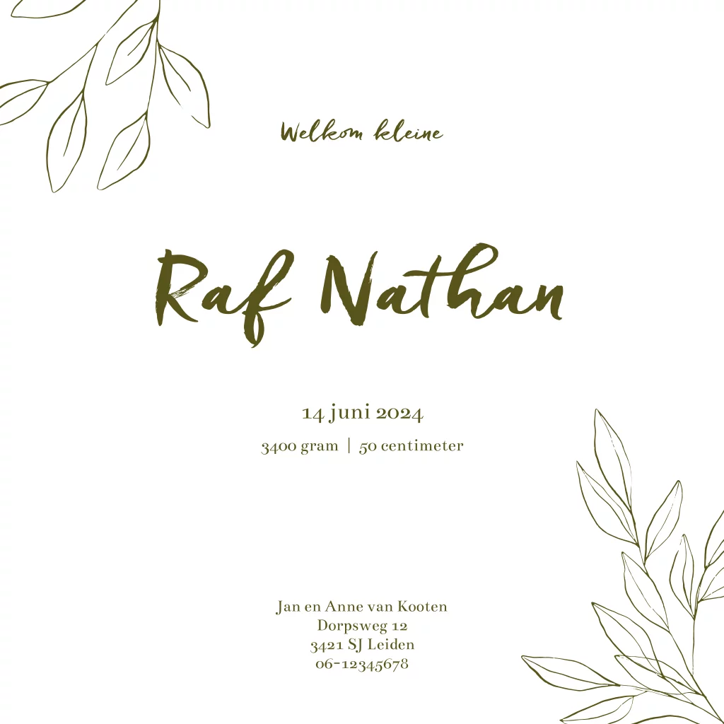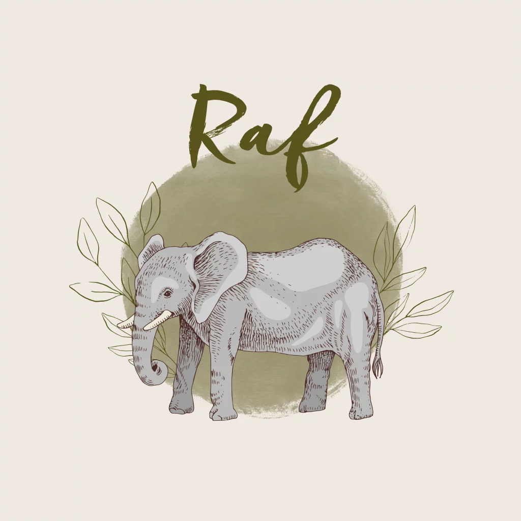 Geboortekaartje met een lieve olifant tussen de blaadjes