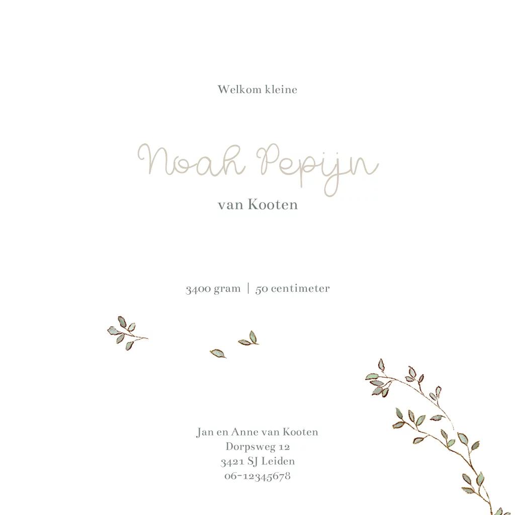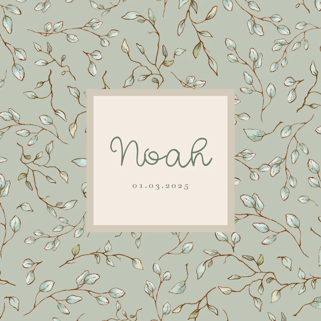 Geboortekaartje met een vrolijk patroon van groene blaadjes