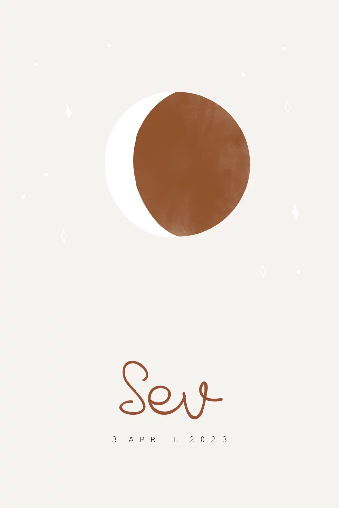 Geboortekaartje met roestbruine maan en gouden maan er overheen. Dit kaartje is er ook met een okergele maan. Heb jij de wens voor een andere kleur maan? Mail naar info@studiodijs.nl en wij maken het voor je gereed.