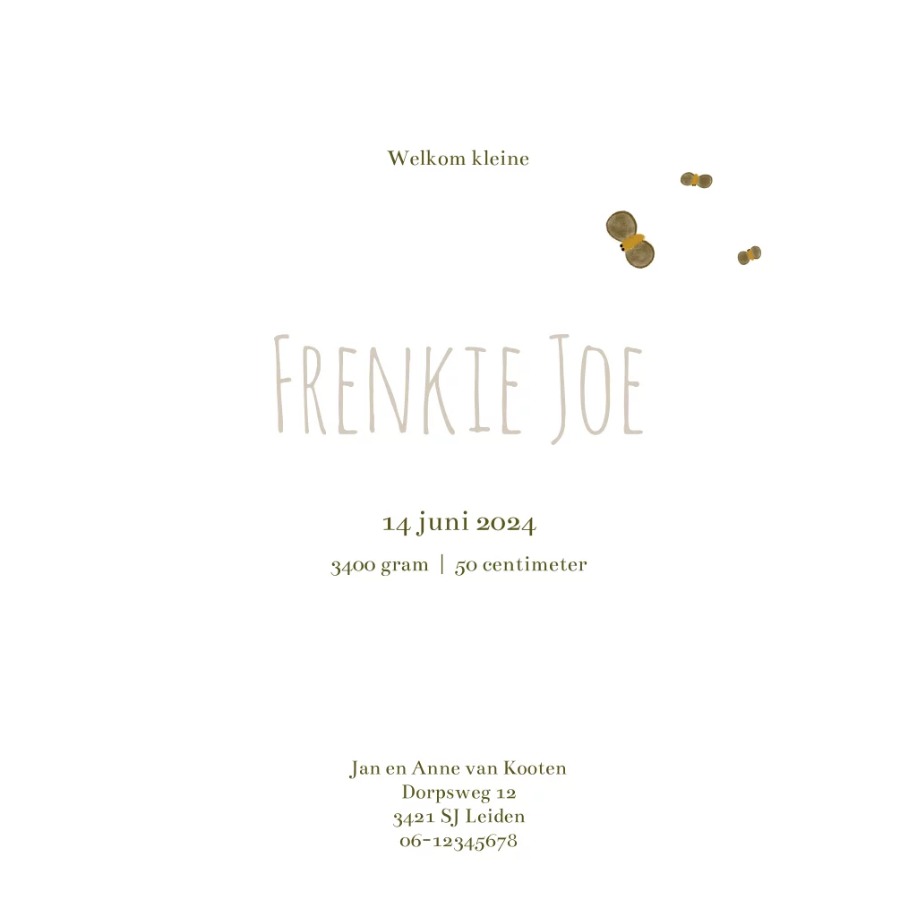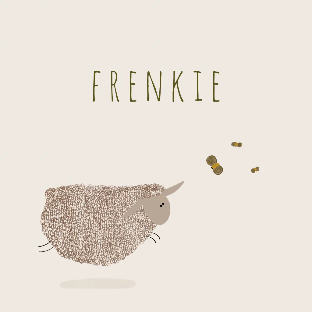 Een vrolijk geboortekaartje met een blij schaapje rennend achter de bijtjes aan.