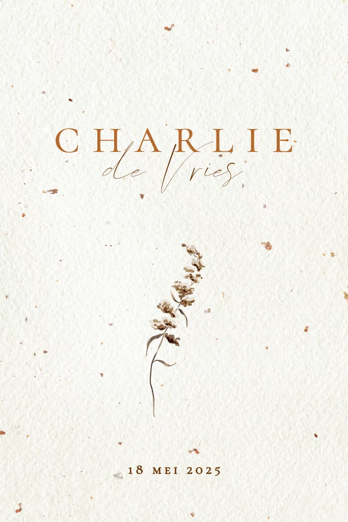 Een minimalistisch geboortekaartje met een fijne structuur achtergrond. Gecombineerd met een prachtig eenvoudige veldbloem. Een prachtig kaartje voor zowel een jongen als een meisje.