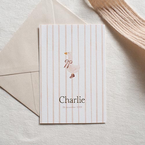 Een neutraal geboortekaartje. Met een eend met laarsjes aan en een streepjes patroon op de achtergrond. De naam op de voorzijde staat in goudfolie.